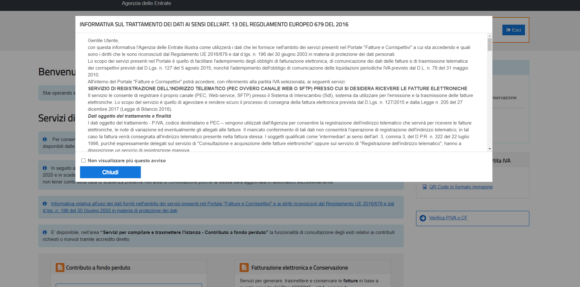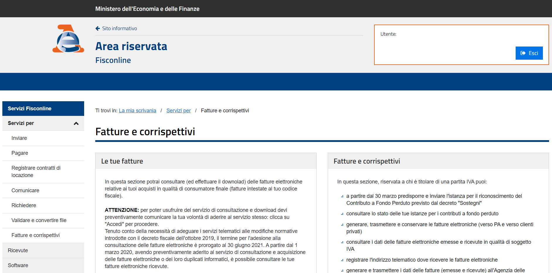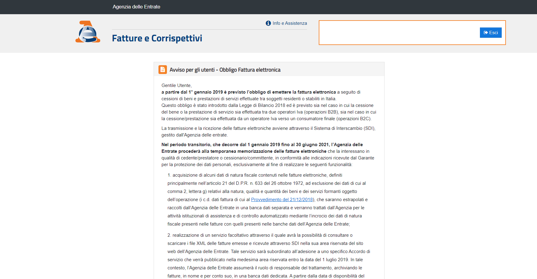 Il portale riporta un avviso sul periodo transitorio che si concluderà il 30 giugno 2021 per quanto riguarda lo lo strumento di consultazione delle fatture elettroniche a cui è possibile aderire recuperando i documenti emessi e ricevuti dal 1° gennaio 2019, data di debutto dell’obbligo di fatturazione elettronica.
